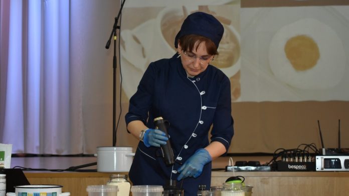 Екатерина Астахова-Оленчук представила на суд жюри в том числе блюдо молекулярной кухни: яичницу из персика в молочной заливке, приготовленную особым образом. По вкусу – сладкий десерт, по виду и форме – яичница глазунья.