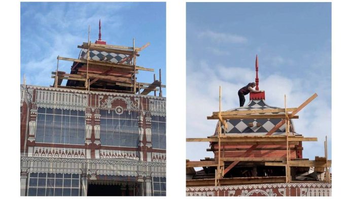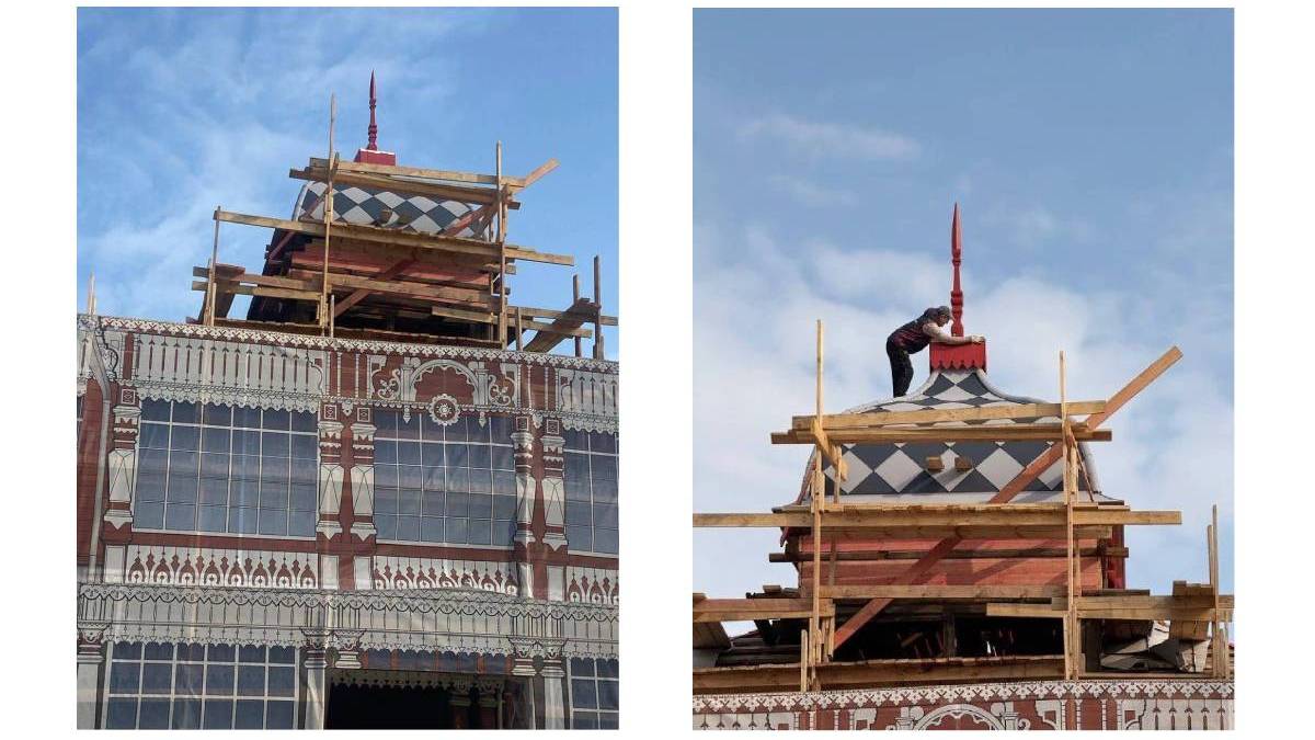 Теперь здание выглядит выше, так как в конструкцию вернули ранее скрытый декоративный элемент в форме валика. Также рабочие покрывают металлическими листами кровлю, устанавливают деревянные декоративные элементы, слуховые и световые оконные блоки, делают кирпичную кладку цоколя, обшивают карниз деревянными декоративными элементами. В первом квартале 2026 года завершатся работы по бетонированию и укреплению фундамента здания.